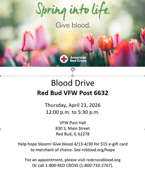 Blood Drive + Add to Google Calendar + iCal / Outlook export 00 days 00 hours 00 minutes 00 seconds Date Apr 23 2026 Time 12:00 pm - 5:30 pm Location Red Bud VFW Post 6632 Hall, 830 S. Main St. Red Bud, IL Category City Events Community Events Share this event