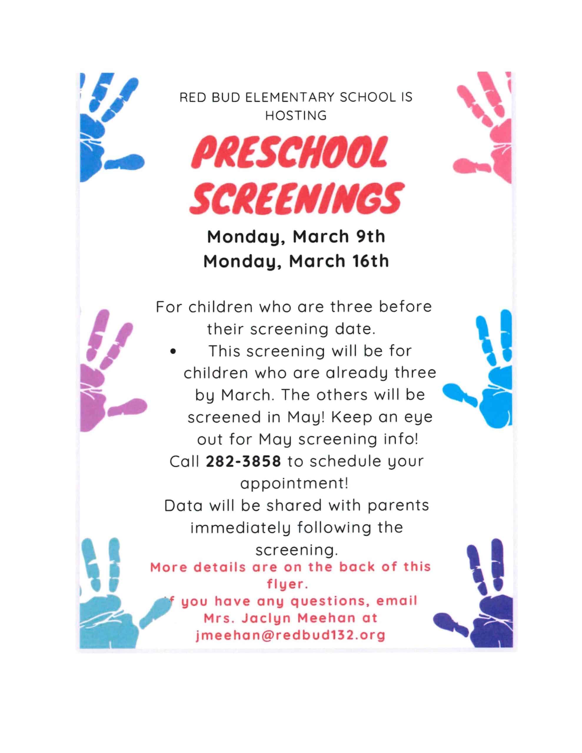 Red Bud Elementary will hold preschool screening on March 9 and 6th for children who are residents in Red Bud District #132. To be eligible, the child must be at least 3 years old, but not turning 5 on or before September 1, 2026. Appointments can be made by calling the elementary office at 618-282-3858.
