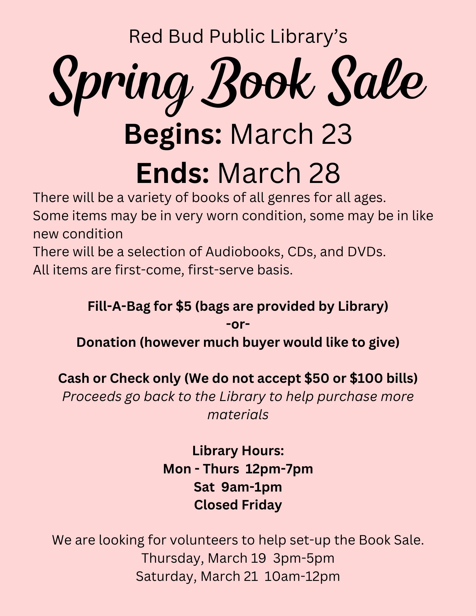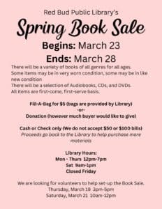 Spring Book Sale + Add to Google Calendar + iCal / Outlook export 00 days 00 hours 00 minutes 00 seconds Date Mar 23 - 26 2026 Time 12:00 pm - 7:00 pm Location Red Bud Public Library, 925 S. Main St. Red Bud, IL Category City Events Community Events Share this event